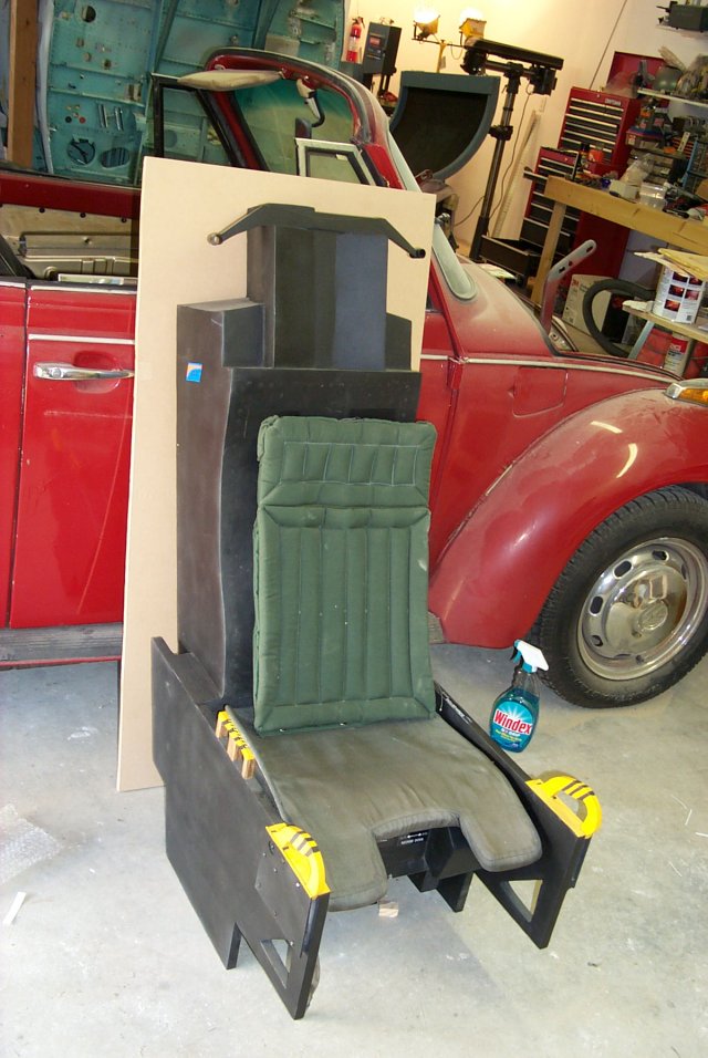 This is the ACES II replica that Rob & I built for the F-15. It was based upon Chris Van Lierop's great F-16 ACES II plans. We made the needed design changes as required by the current ejection seat mounting and model differences in the F-15 version of the ACES II seat. The seat was constructed from 1/2" and 3/4" plywood. The seat pan and back are made from 1/8" MDF (Medium Density Fiberboard). The picture below is a right side view of the seat. The faded pink coloring comes from the layer of Bondo that coats the wood. The whole seat was laminated with Bondo to give the seat a metallic feel as well as a smooth surface.![]()