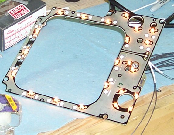 This shows the two PCBs close up and personal. The button PCB is on the left and the lighting PCB is on the right. To allow the boards to be re-laminated, the solder "dome" on the inside surface of the PCB couldn't be more than 1/32nd" high. I'm really glad that Weller makes a nice and small soldering iron tip. :)